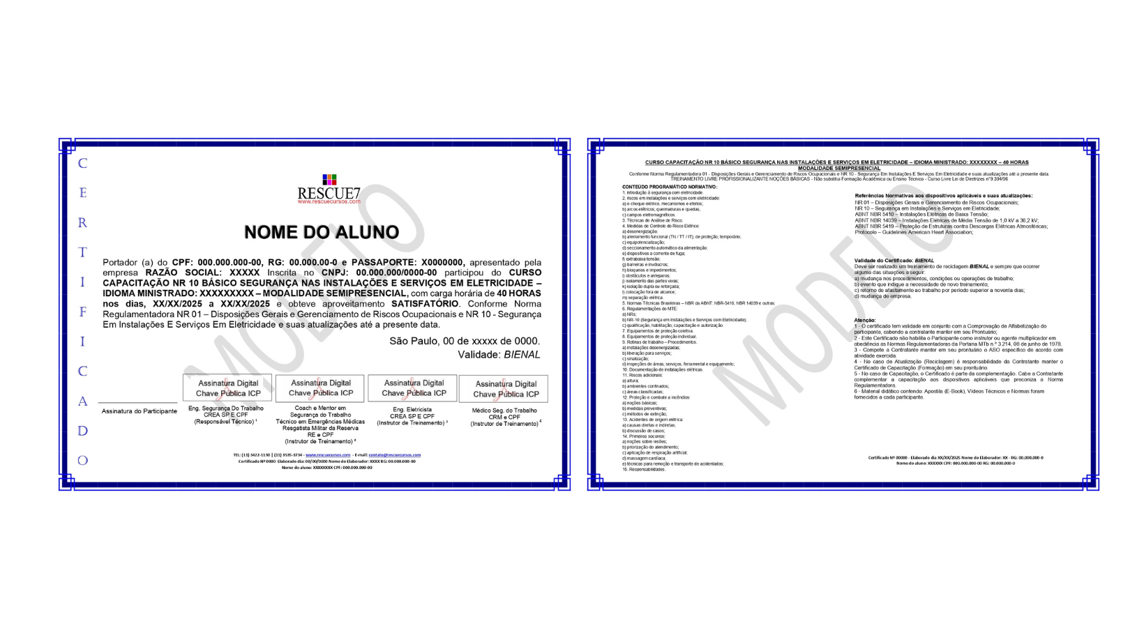 Todos os certificados emitidos pela RescueCursos passam por validação digital ICP-Brasil, contendo assinaturas eletrônicas verificáveis, garantindo autenticidade e validade legal.