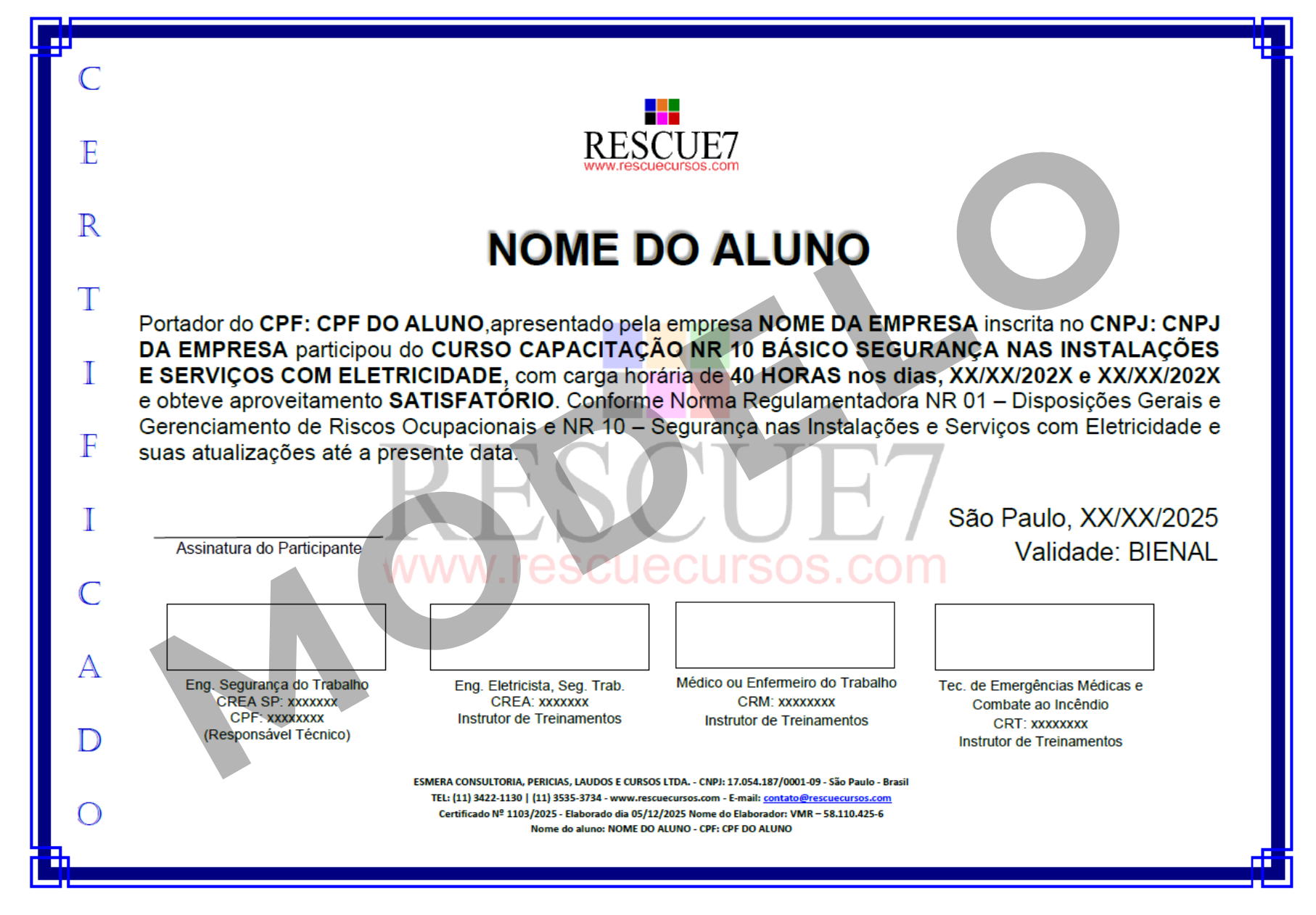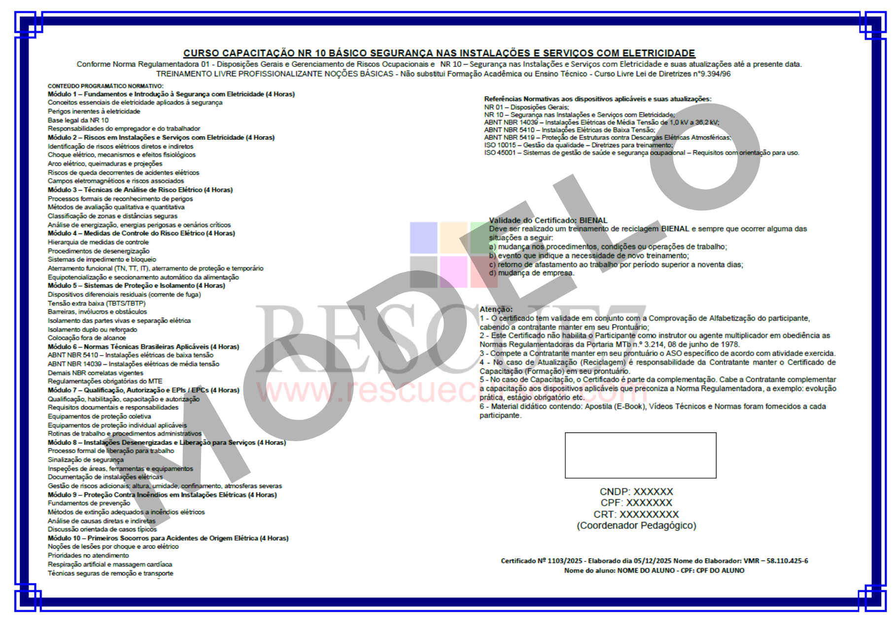 Todos os certificados emitidos pela RescueCursos seguem estritamente os parâmetros legais estabelecidos pela Norma Regulamentadora 01 (NR 01) e seus anexos, além de demais normas e dispositivos complementares aplicáveis.