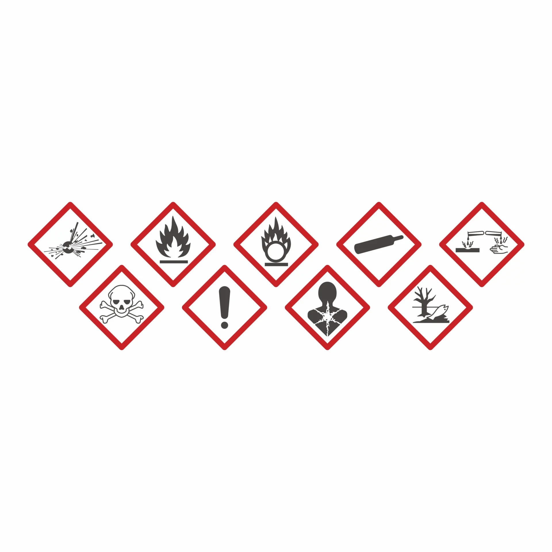 Servem para alertar sobre perigos físicos, riscos à saúde humana e danos ao meio ambiente. Por isso, os responsáveis dispõem cada símbolo em um losango vermelho com fundo branco, o que garante visibilidade imediata em qualquer embalagem ou documento de segurança.