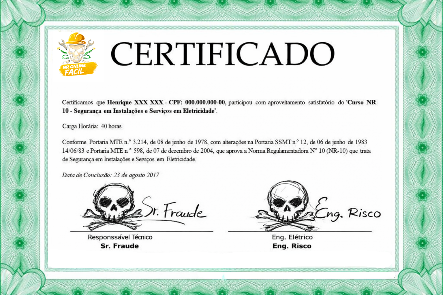 Além disso, do ponto de vista jurídico, esse tipo de certificado equivale a um papel em branco. A Justiça do Trabalho não reconhece como validação independente um documento em que o profissional atestou a própria competência. Portanto, em qualquer investigação de acidente ou auditoria do MTE, esse certificado não resiste ao primeiro questionamento técnico.
