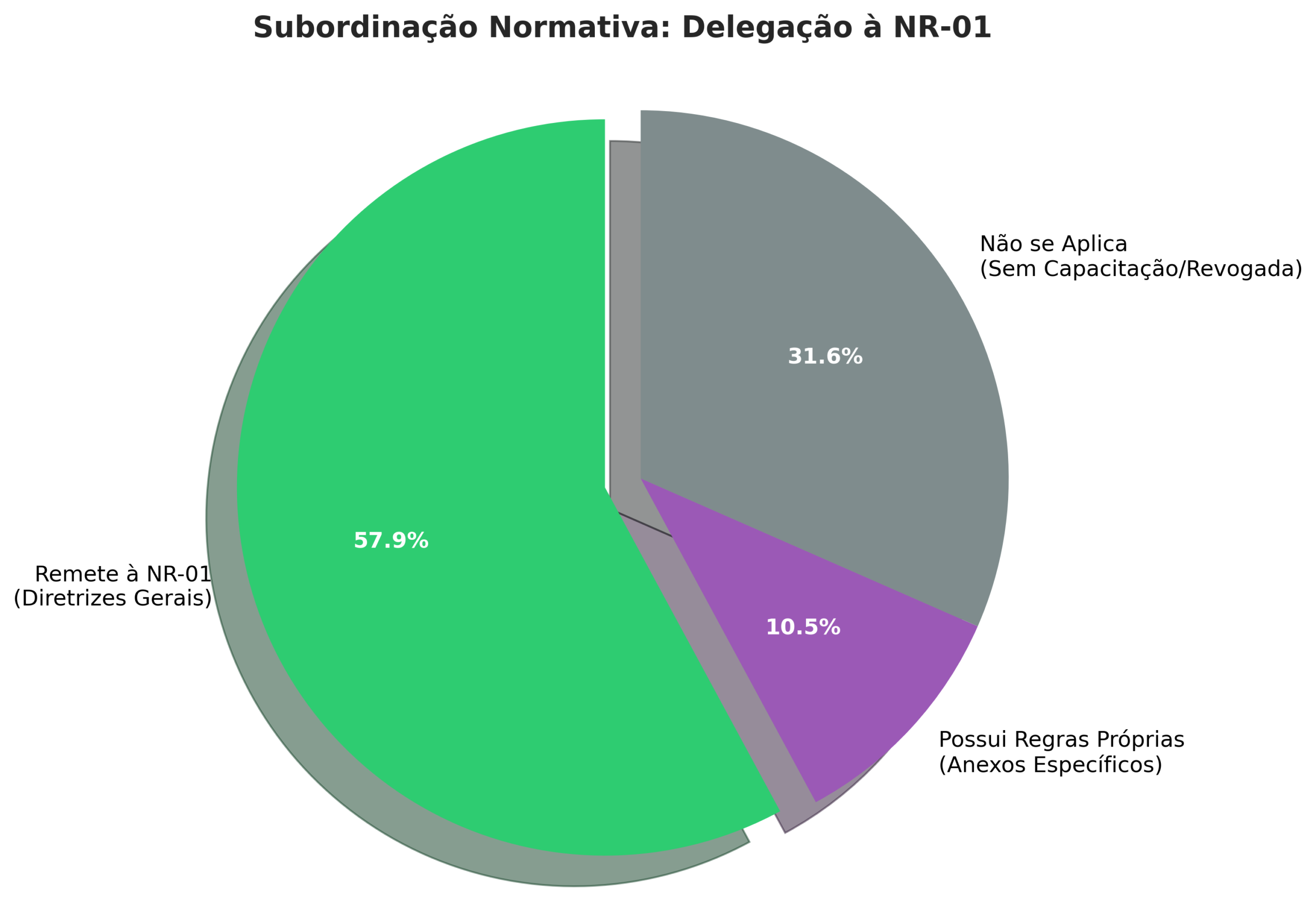 >10,5% (4 NRs): Possuem anexos próprios tão rigorosos que sobrepõem as regras gerais (Ex: NR-10 Anexo III, NR-12 Anexo II).