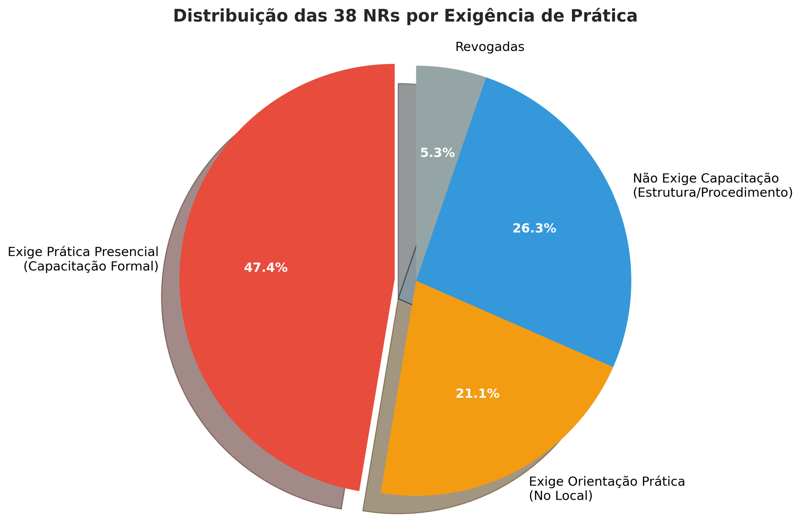 47,4% (18 NRs): Exigem capacitação formal com prática presencial obrigatória (Ex: NR-10, NR-12, NR-20, NR-33, NR-35).