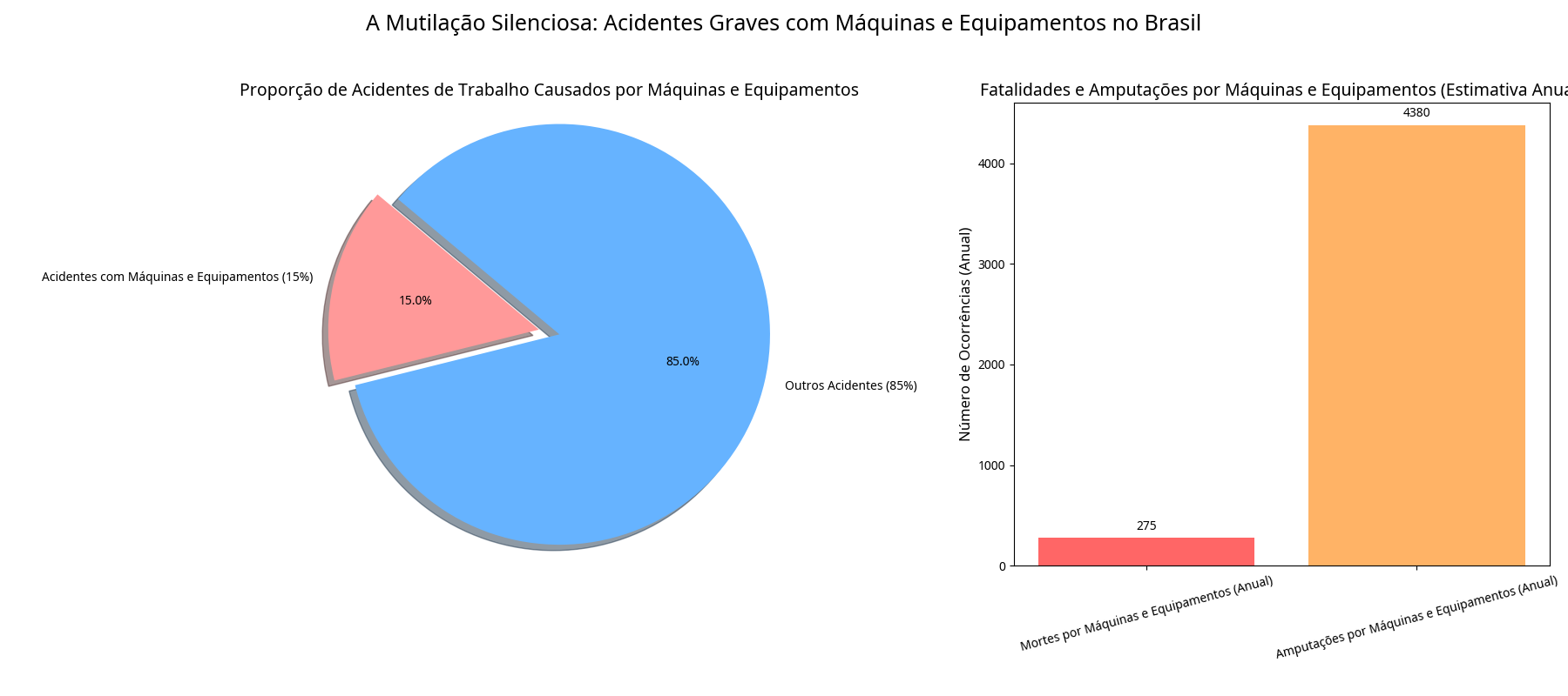 Máquinas e equipamentos representam cerca de 15% dos acidentes de trabalho, mas concentram alto impacto: centenas de mortes e milhares de amputações por ano, evidenciando falhas graves na aplicação da NR 12