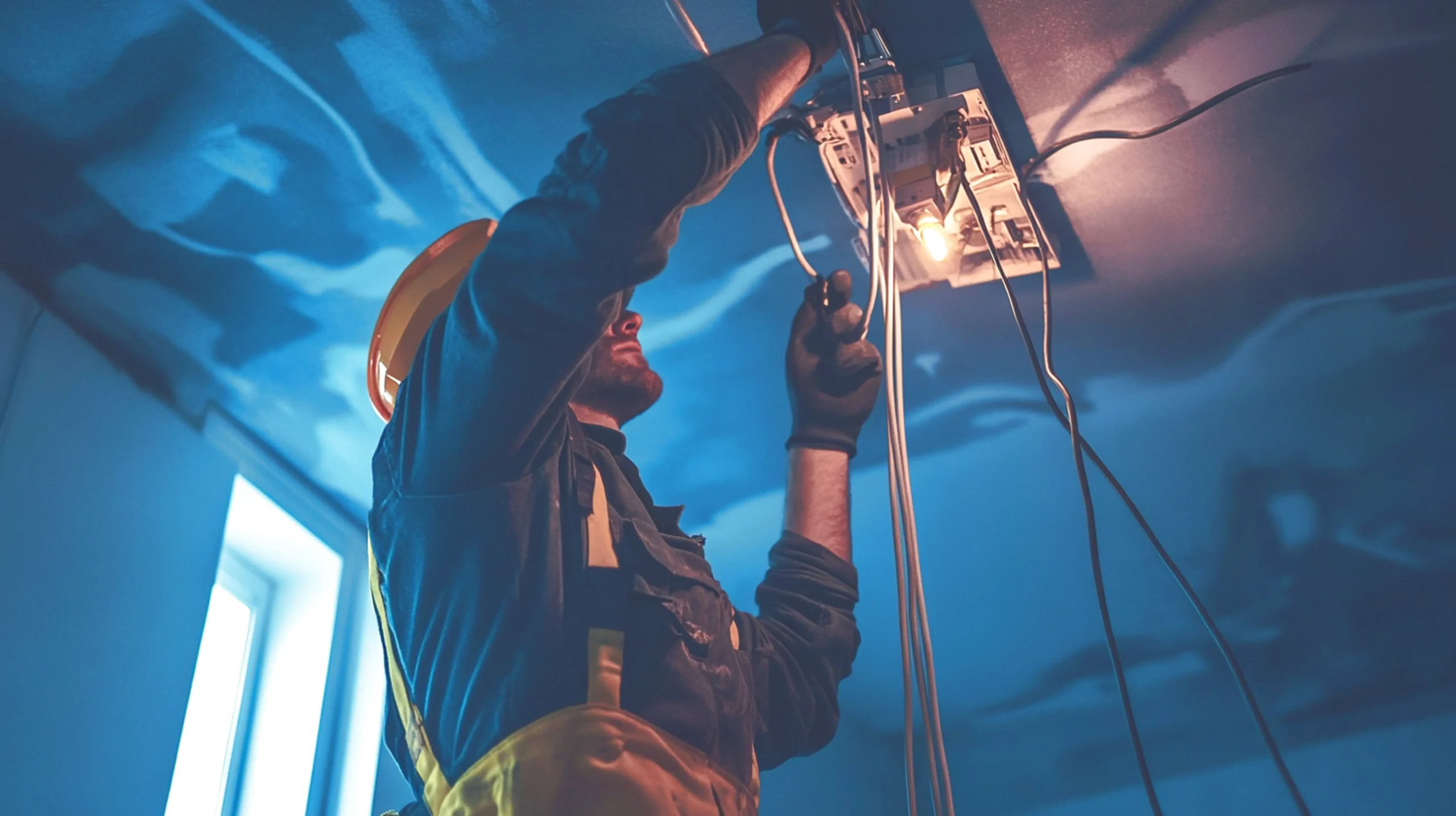 Lavoratore specializzato prepara e isola conduttori elettrici per la connessione, utilizzando utensili adeguati e protezioni individuali, dimostrando l’importanza della competenza pratica nella prevenzione degli incidenti elettrici.